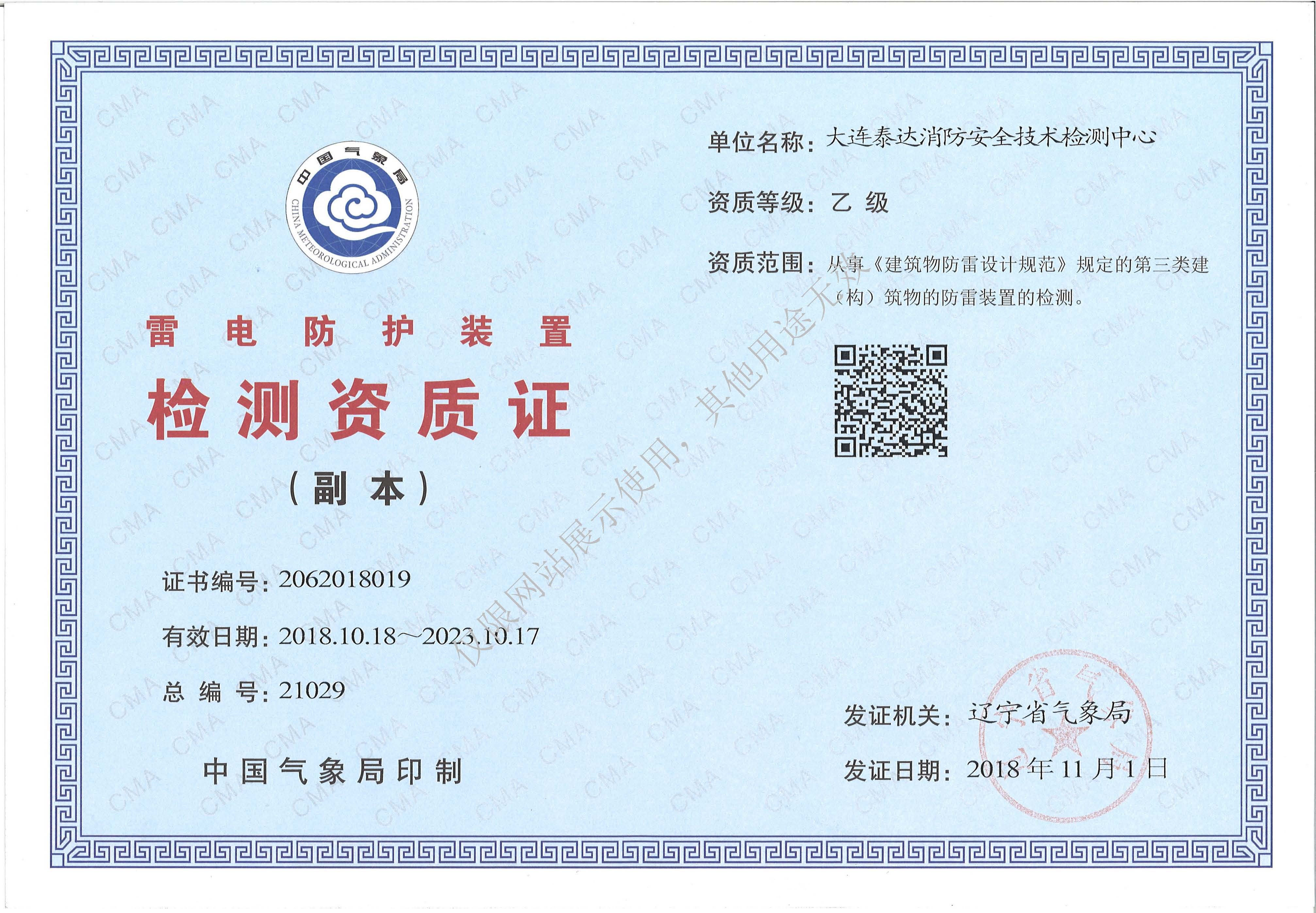 · 是經(jīng)“社會消防技術(shù)服務(wù)信息系統(tǒng)”備案并公示的消防技術(shù)服務(wù)機(jī)構(gòu),已取得中國氣象局頒發(fā)的雷電防護(hù)裝置檢測資質(zhì)證書、遼寧省質(zhì)量技術(shù)監(jiān)督局審核批準(zhǔn)的檢驗檢測機(jī)構(gòu)資質(zhì)認(rèn)定證書(CMA)及包括消防檢測、電氣檢測、雷電防護(hù)裝置檢測、防火涂層厚度檢測等在內(nèi)的200余項檢驗檢測能力,取得大連市應(yīng)急管理局頒發(fā)的安全生產(chǎn)標(biāo)準(zhǔn)化證書,獲得質(zhì)量管理體系、環(huán)境管理體系、職業(yè)健康安全管理體系認(rèn)證證書,是經(jīng)備案的高新技術(shù)企業(yè),可獨立出具具有證明作用的檢測報告。